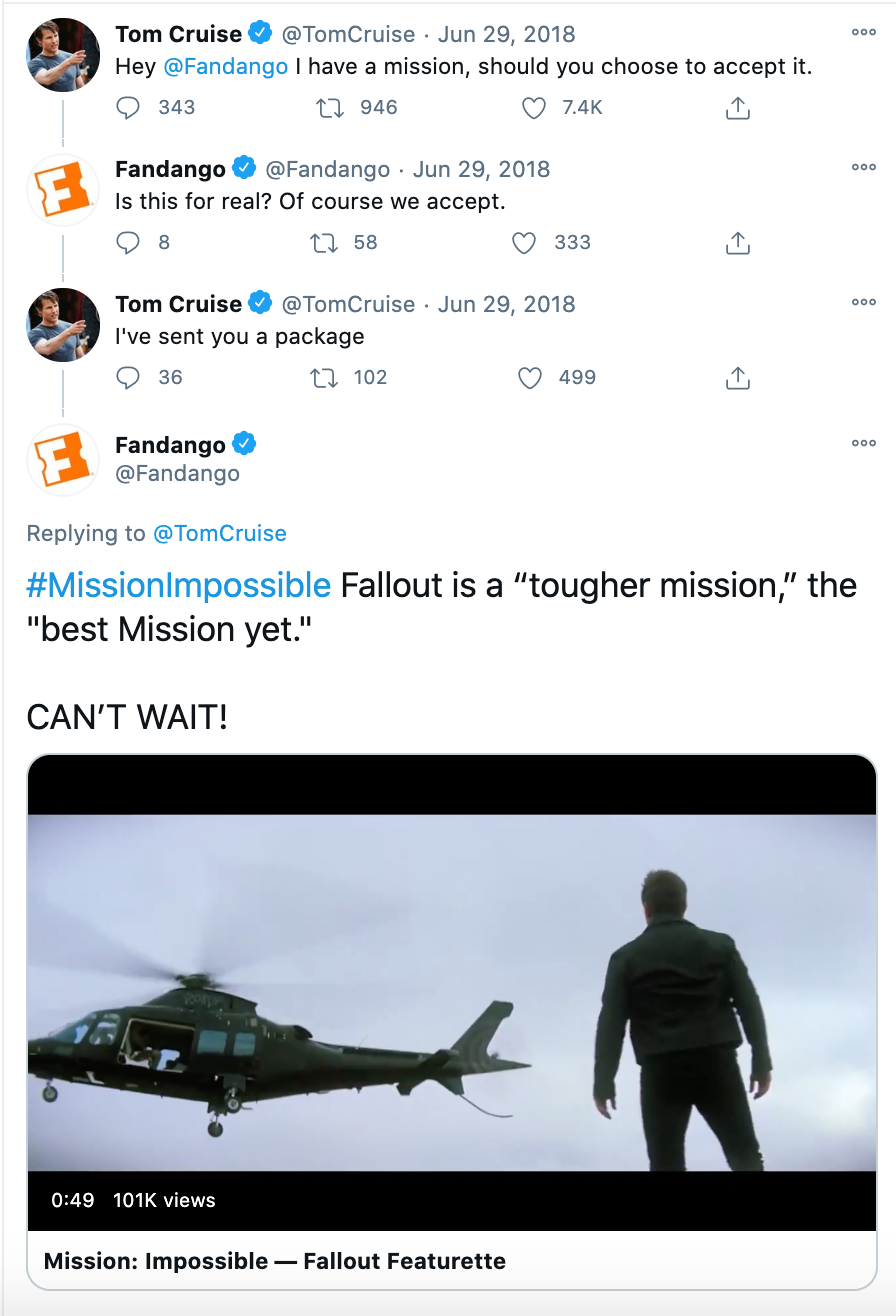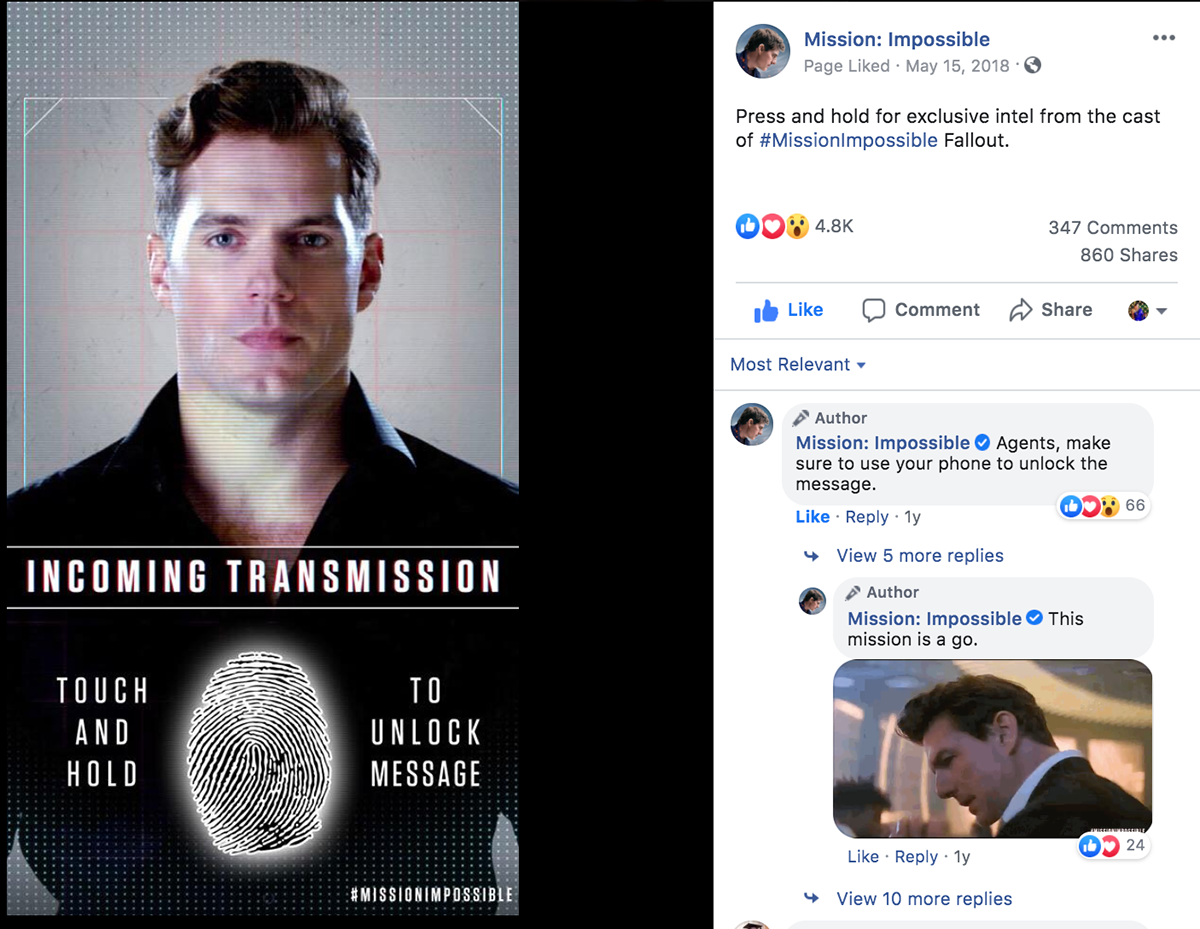 For Mission: Impossible Fallout, we wanted to invite fans into this exciting mission, so we created interactive content like this press and hold graphic on Facebook that allowed fans to receive a custom transmission from talent with new footage.